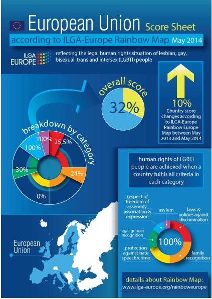 ILGA-Europe’s rainbow map clearly depicts the EU’s progress, and where it is falling down in the protection of LGBTI people from hate crime and hate speech, family recognition, laws and policies tackling discrimination, and legal gender recognition.