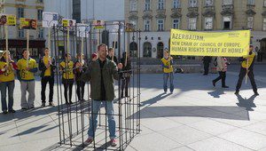 On Tuesday, when Ministers from across Europe gathered in Vienna to hand the Chair of the Council of Europe to Azerbaijan, they were greeted by an unexpected “delegation”. A vocal group of us – all Amnesty activists – were protesting against the intimidation, detention and continuing violence directed at critics of Azerbaijan’s authorities. One of our group stood in a cage, a reminder of the numerous prisoners of conscience still in jail solely for speaking out against their government.