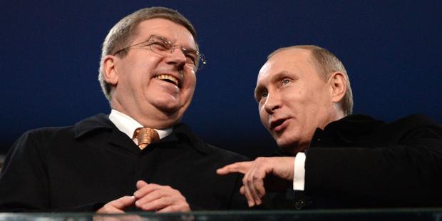 Russia’s President Vladimir Putin (R) speaks with International Olympic Committee (IOC) President Thomas Bach during the Opening Ceremony of the Sochi Winter Olympics.© ANDREJ ISAKOVIC/AFP/Getty Images