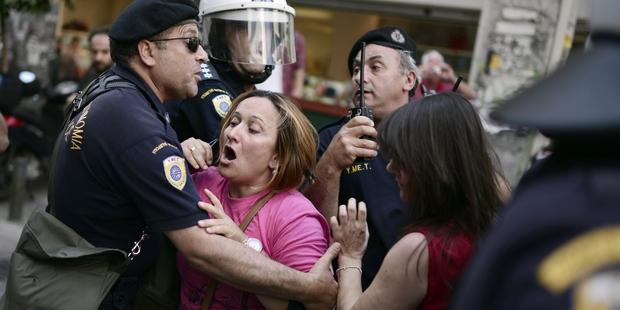 Evangelia Alexaki, a 57-year-old protester who was among the 397 staff laid off, said police hit the women with their shields and kicked them.